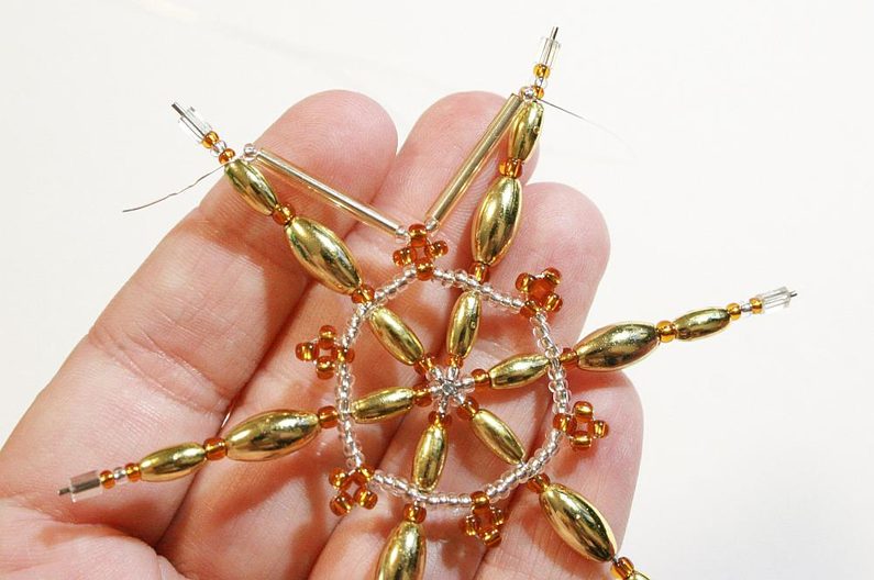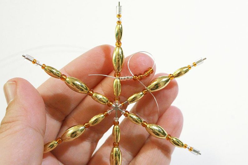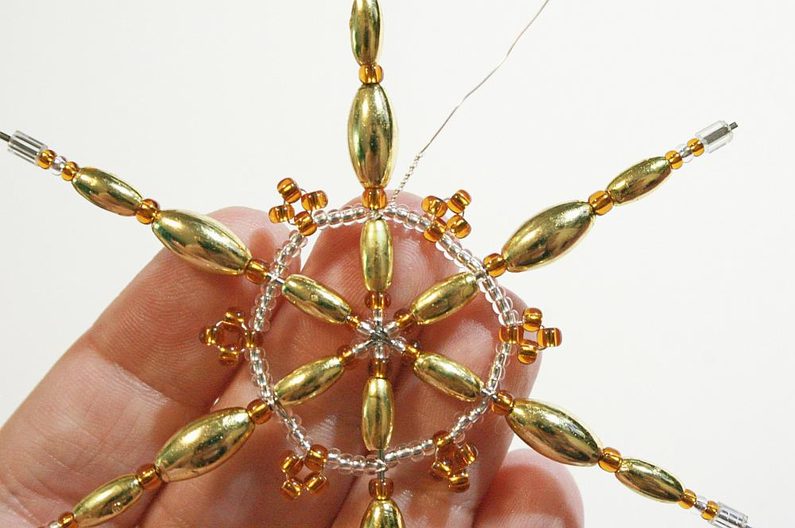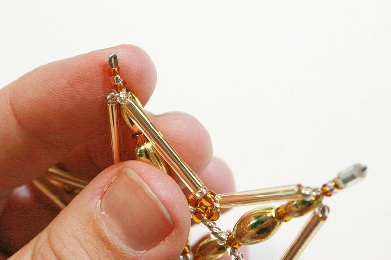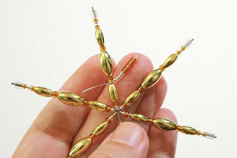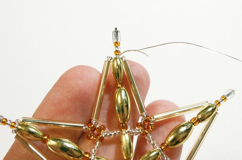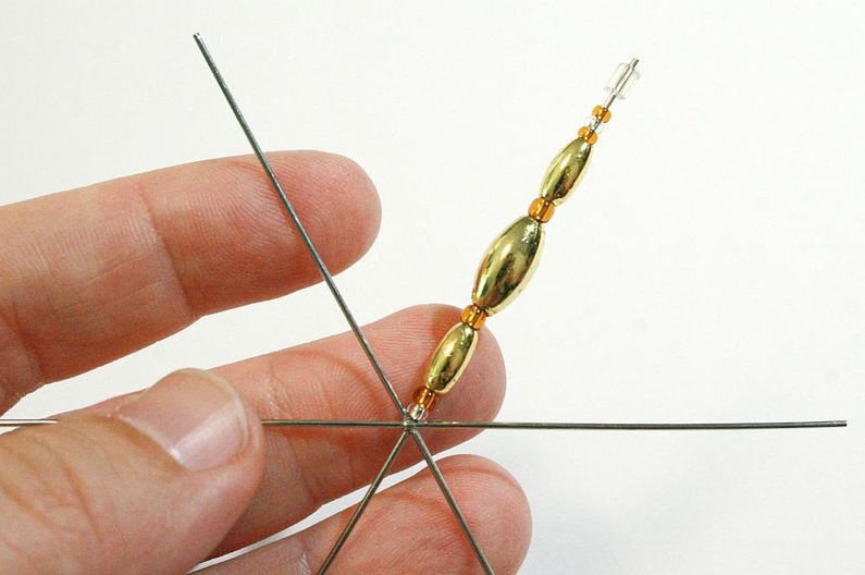 Ustřihneme další kus drátku dlouhý cca 1m. Uděláme pár otoček na jednom z ramen hvězdy mezi korálkem PR10b a malou olivkou. Dále navlékneme na drát korálky v takovémto pořadí: PR10a – trubička – PR10a a projdeme drátkem skrz horní korálek kytičky, kterou jsme udělali na předchozím kroku (Obr. 8). Navlékneme opět PR10a – trubička – PR10a a uděláme dvě otočky kolem dalšího ramena hvězdy (Obr. 9).