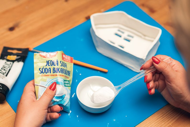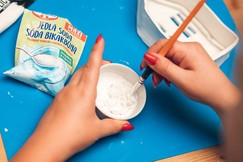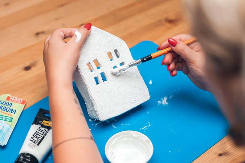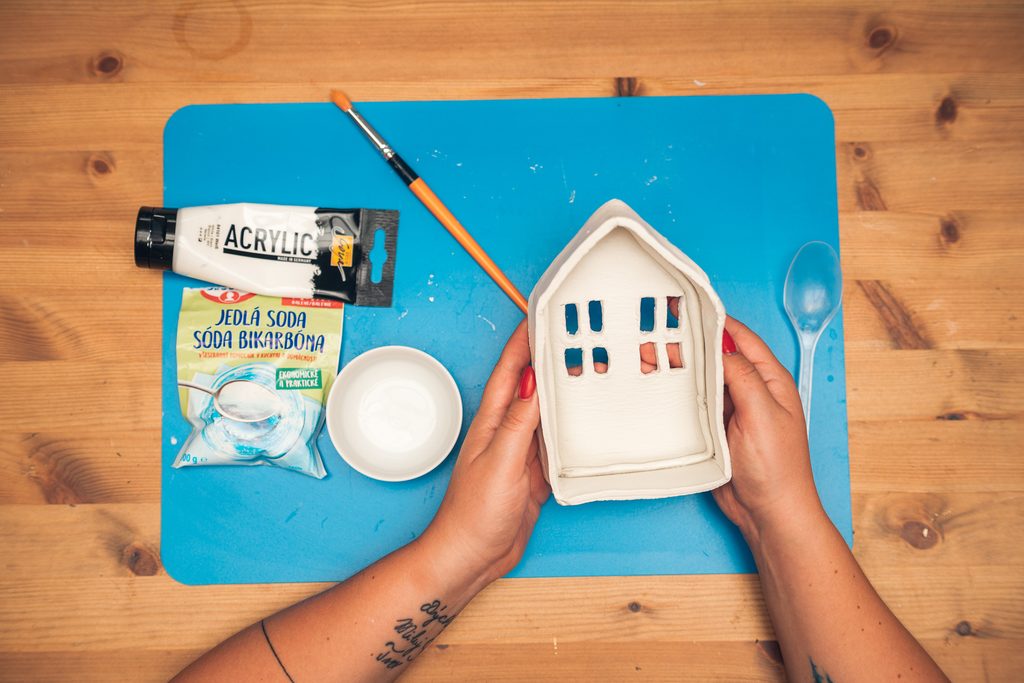 Po vytvrdnutí můžeme domeček nadekorovat. Akrylovou barvu smíchejte s jedlou sodou, aby vytvořila hustější pastu. Pomocí štětce jí pokryjte celý domek ze všech stran. Nechte několik hodin zaschnout a je hotovo.