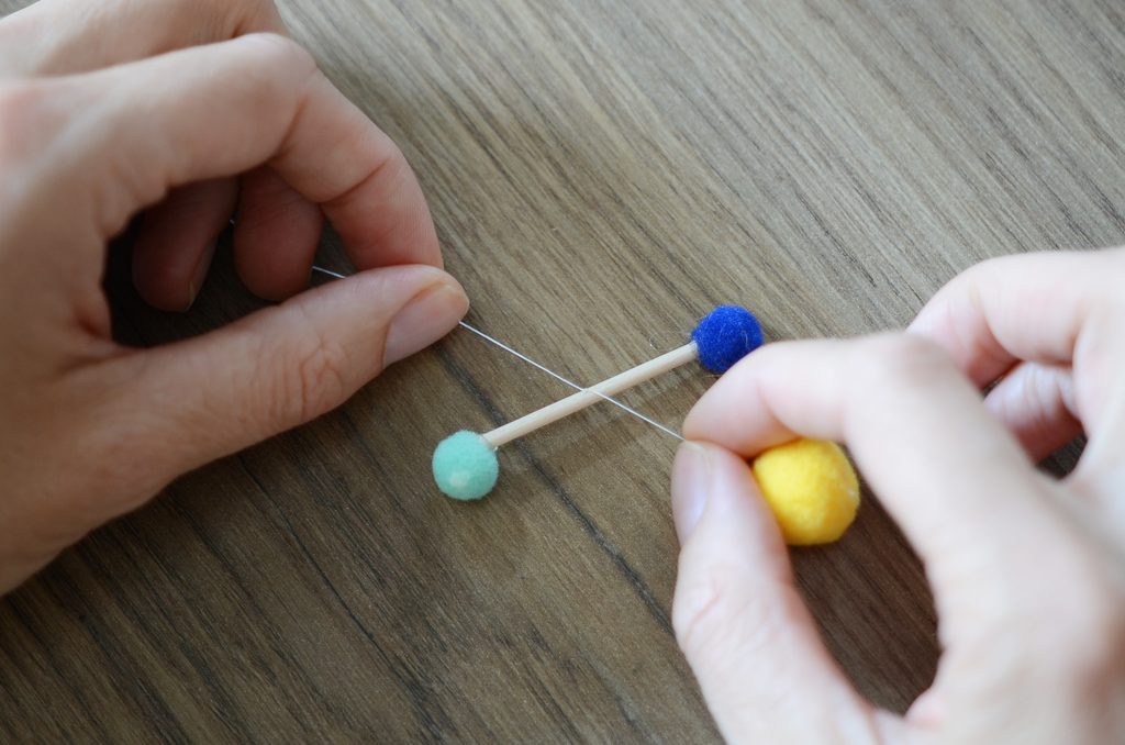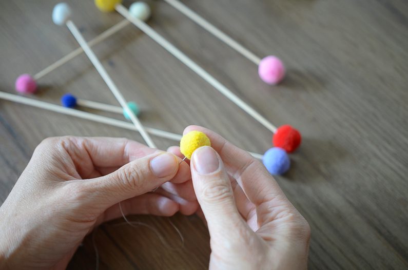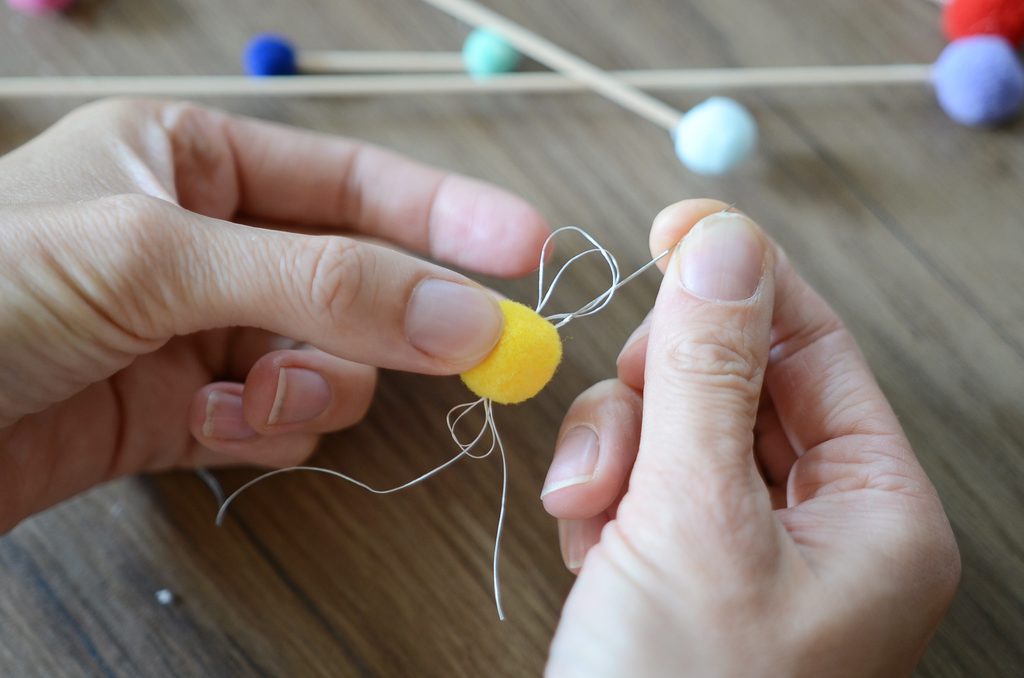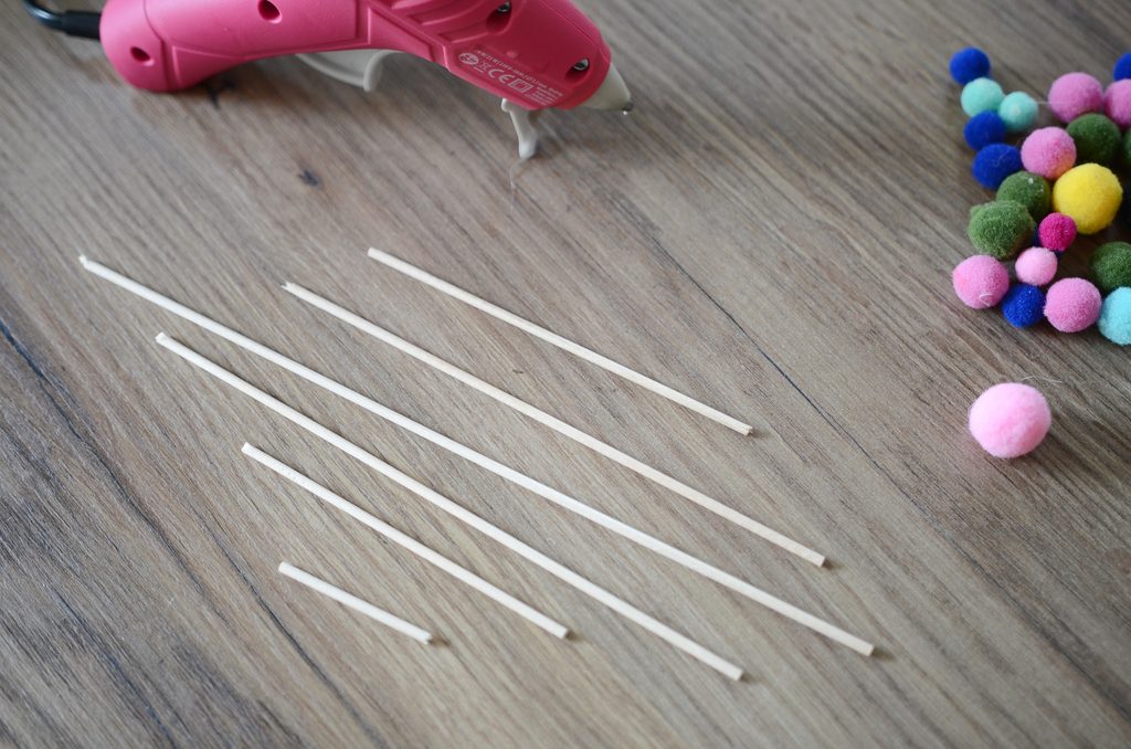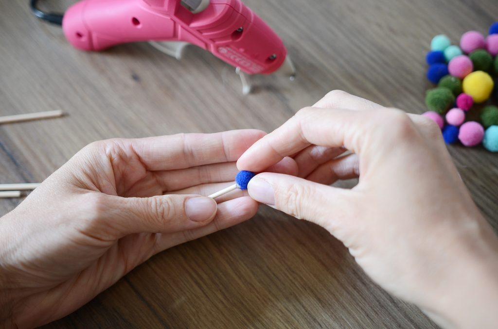 Na konce špejlí nalepte bambulky – na jednu špejli zvolte vždy stejnou velikost.