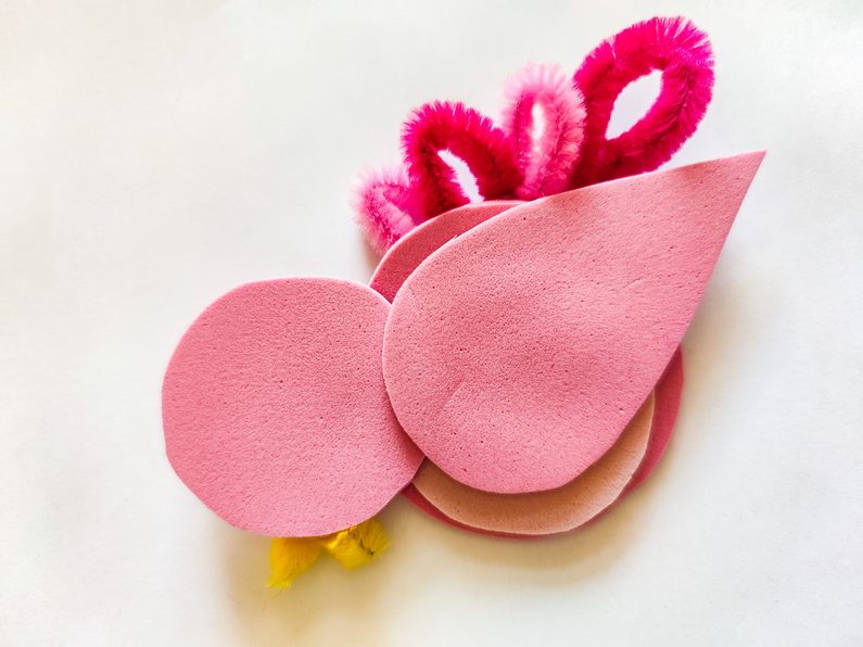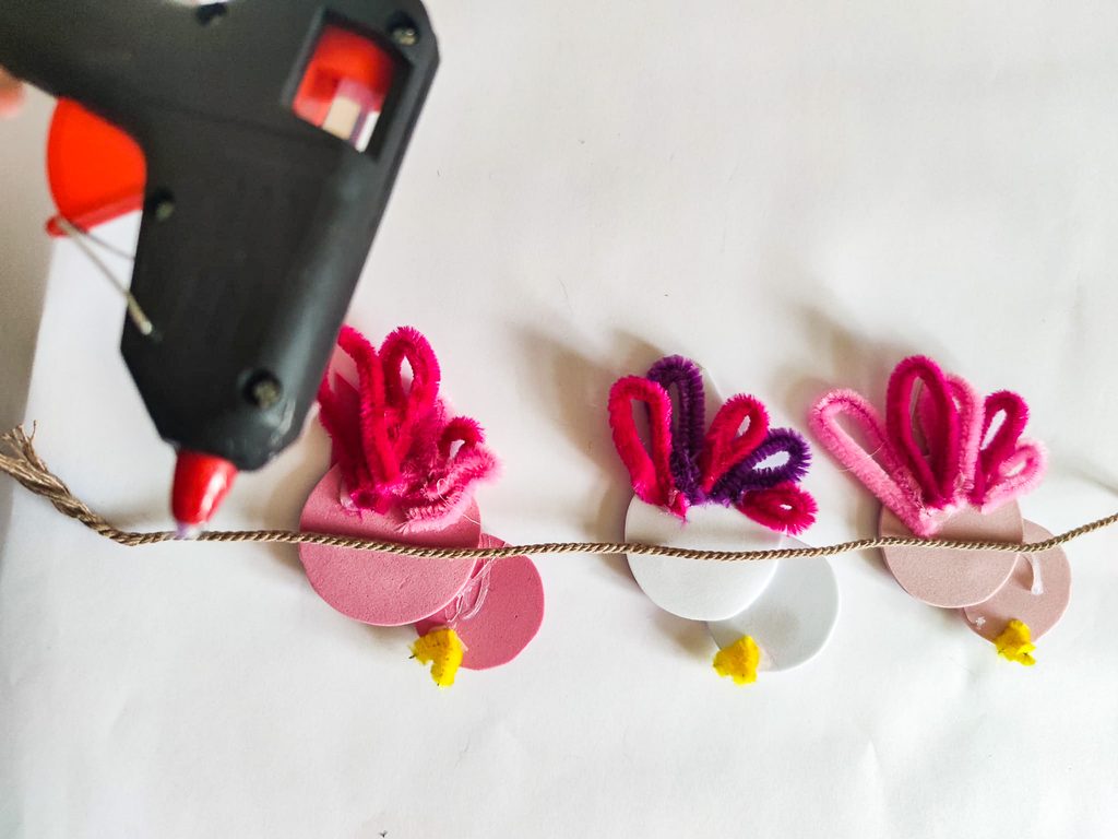 Vystříhané díly spojíme k sobě a zezadu je tavnou pistolí slepíme. Vystříháme si také různé délky a různé barvy chlupatého drátku, ohneme v polovině a zezadu opět přilepíme ocásek ptáčkům a zobáčky.