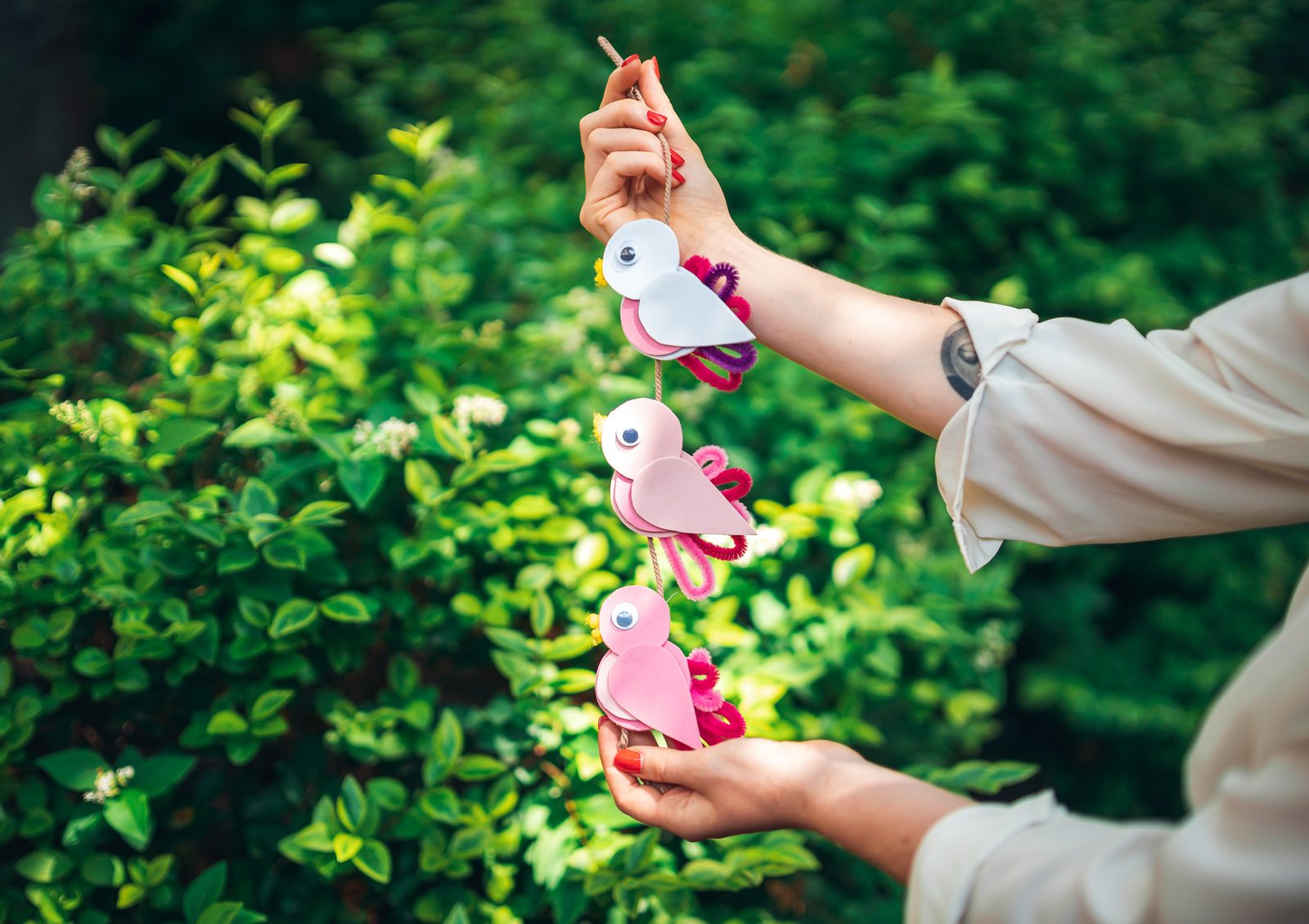 Nalepíme tavnou pistolí ptáčkům oči a zezadu přilepíme provázek. Tím ptáčky slepíme k sobě. Dáme pozor, aby byli umístění rovně pod sebou. Uděláme nahoře na provázku uzlík a můžeme výtvor zavěsit na zeď.
