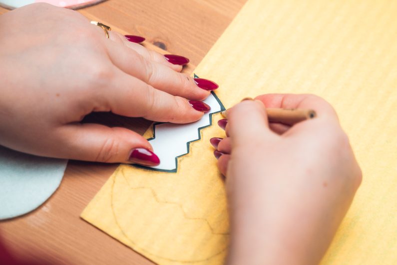 šablony poté vystřihneme vzor, obkreslíme ho na vzorovaný barevný filc a také