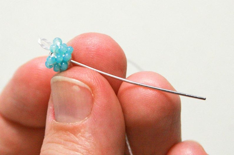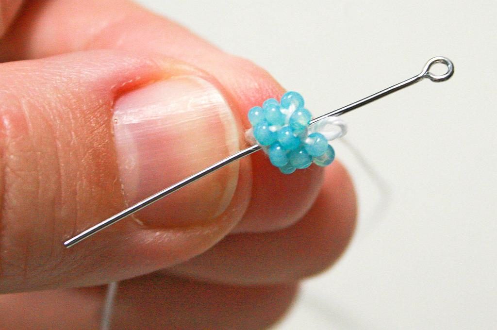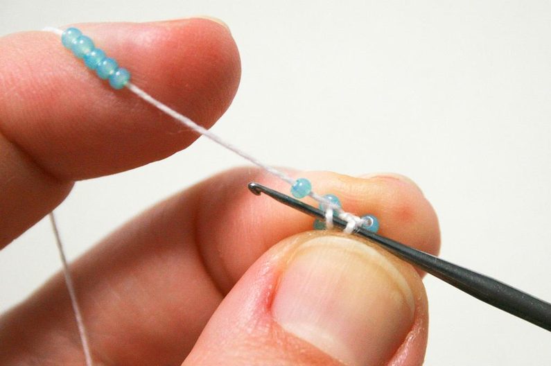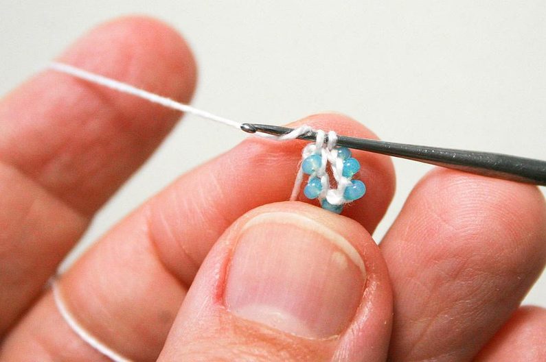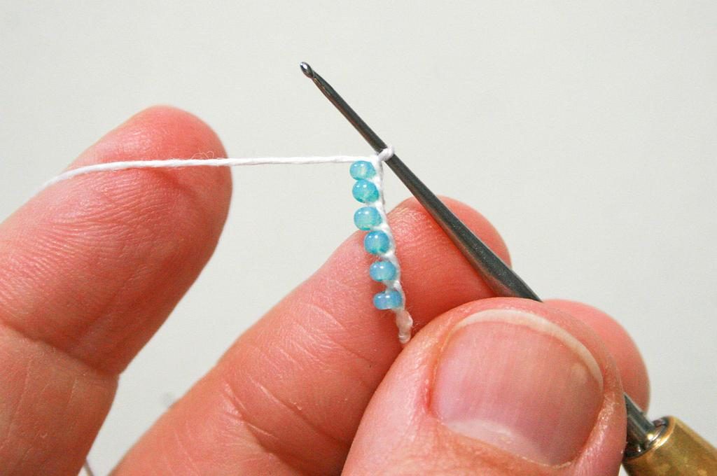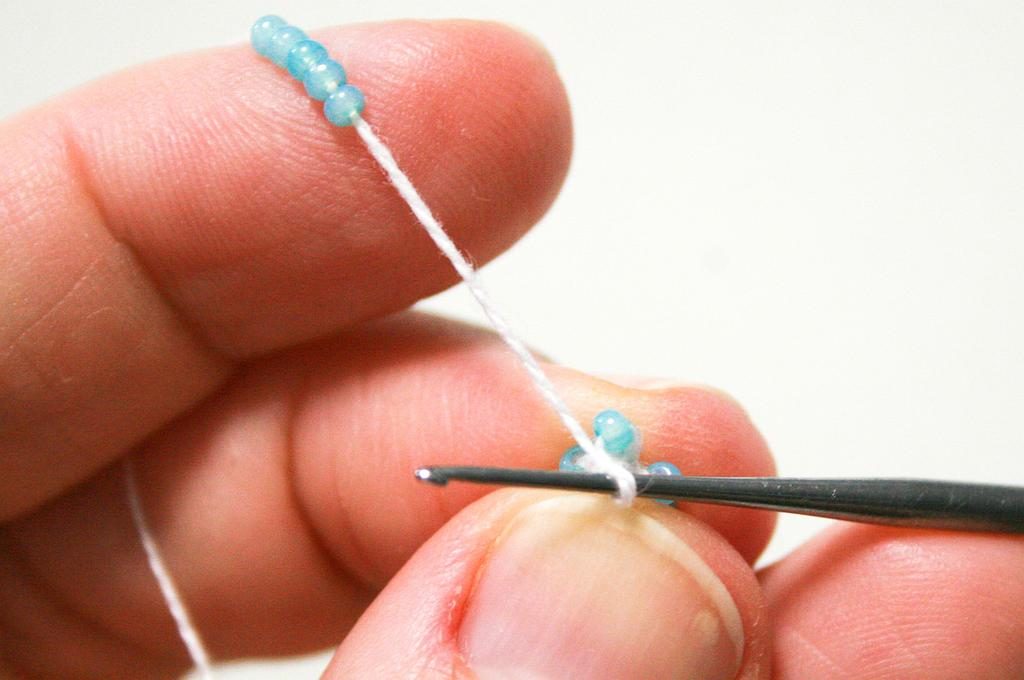 Pak háček zapíchněte do očka zleva od první perličky, otočte perličku dospodu doprava, posuňte co nejblíže další perličku a háčkem zachyťte přízi a uháčkujte pevné očko (protáhněte přízi oběma oky najednou (obr.8-9). Přidáme perličky do druhé řady a háčkujeme pevná oka s perličkami spirálou kolem dokola. Pokud mají všechny perličky ve všech řadách otočenou dírku po směru háčkování (nahoru), postupovali jste správně (obr.10-11)