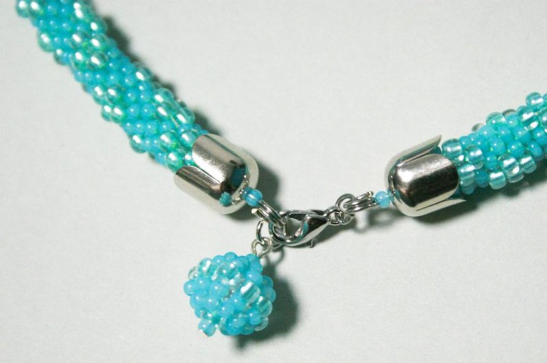 Zapínání připevněte pomocí spojovacích kroužků. Můžete také přidat prodlužovací řetízek s ozdobným korálkem a nebo ušít malý „charm“ a náušnice (obr. 15-17).