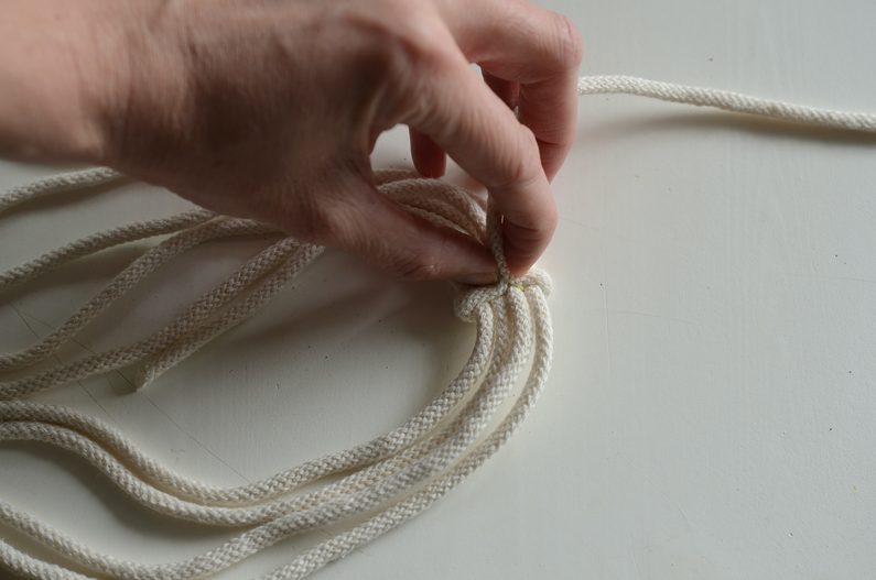 Nastříhejte si čtyři kusy macramé šňůry v délce cca jeden metr (uvažujte délku dle prostoru, kam chcete dekoraci umístit). Šňůry přeložte v polovině. Ustřihněte si další kousek šňůry, podložte jím ohyb a naneste trochu lepidla.