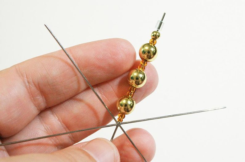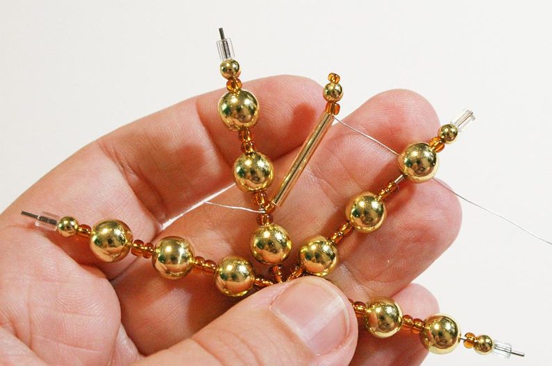 Vyberte z mixu korálků kuličky cca 4 a 8mm. Navlékněte korálky na jednotlivé drátky v takovémto pořadí: PR10 – PR8 – kulička 8mm – 2x PR8 – kulička 8mm – 2x PR8 – kulička 8mm – PR8 – kulička 4mm. Aby se korálky nevyvlékaly z konců drátů, na kterých nepracuji, uzavřeme je silikonovou zarážkou. (Obr.1-2)