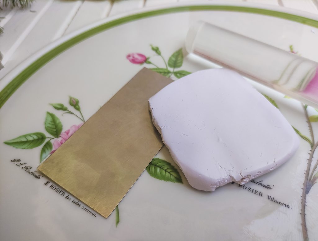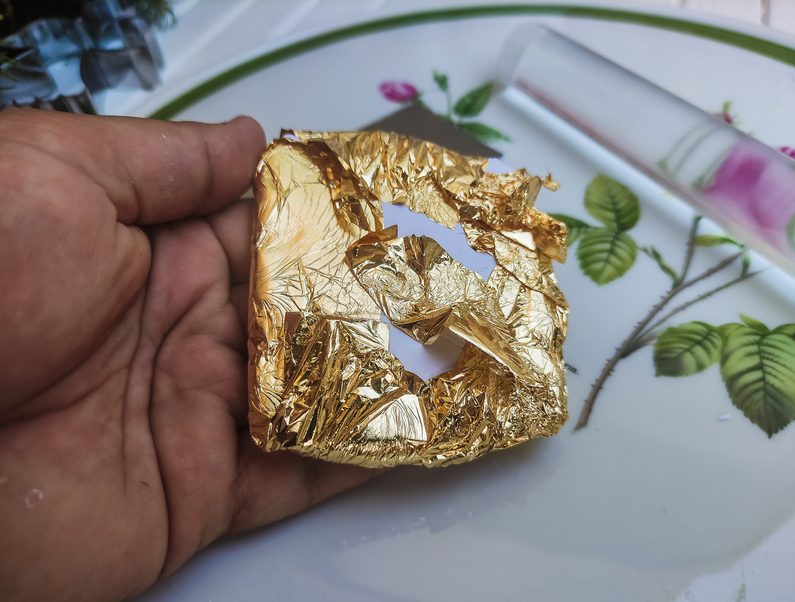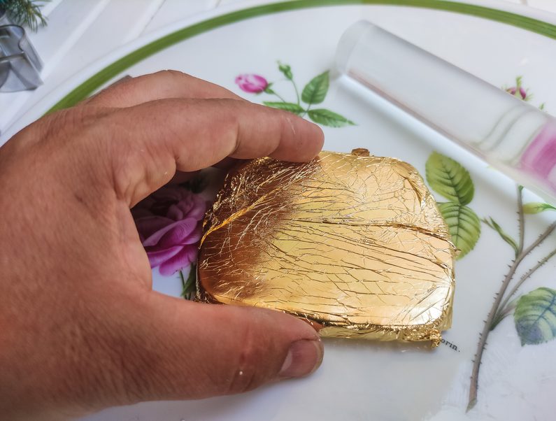 Opatrně vyjmeme kovový plátek z balení, je velmi náchylný k poškození, takže je třeba mít absolutně suché ruce ( plátky jsou od sebe v balení odděleny hedvábným papírem), připravené PREMO obalíme do kovového plátku primárně lícovou stranou.
