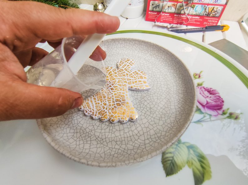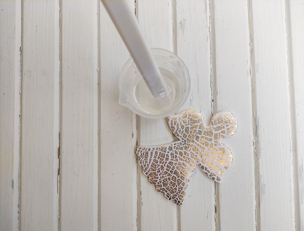 Za pomoci ochraných pomůcek si můžeme rozmýchat pryskyřici pro glazurování dle návodu na balení (2:1). Doporučujeme dlouho míchat a nechat odstát, aby utekly bublinky. Anděla si buď podložíme pečícím papírem nebo můžeme použít silikonovou podložku k pro práci s pryskyřicí.