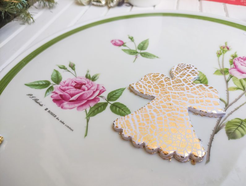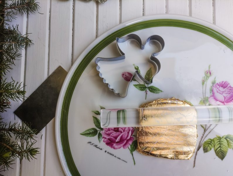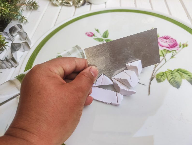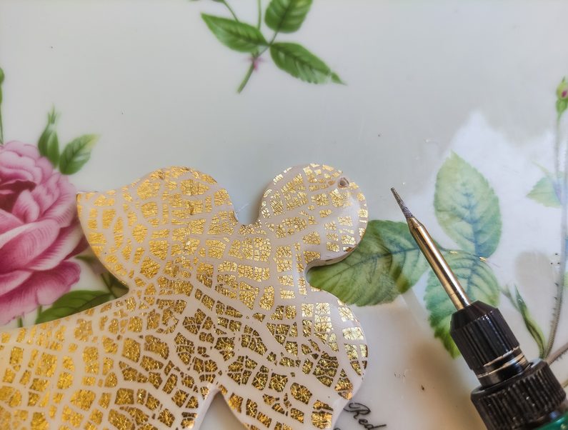 Poté vykrojíme anděla. Pokud budeme pro povrchovou úpravu nalévat pryskyřici, pro vytvoření lesklého „glam“ povrchu - nikdy neděláme otvor. Pokud počítáme pouze s lakem na FIMO hmotu, tak otvor vadit nebude. Odstraníme přebytečné kusy PREMA a déme výrobek péct na 130 stupňů do trouby po dobu 15 – 30 minut. Poté necháme schladnout. Nikdy nepoužíváme ani plynovou troubu, ani mikrovlnou!