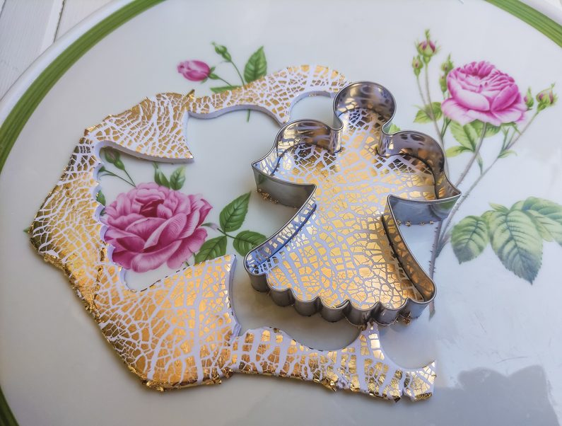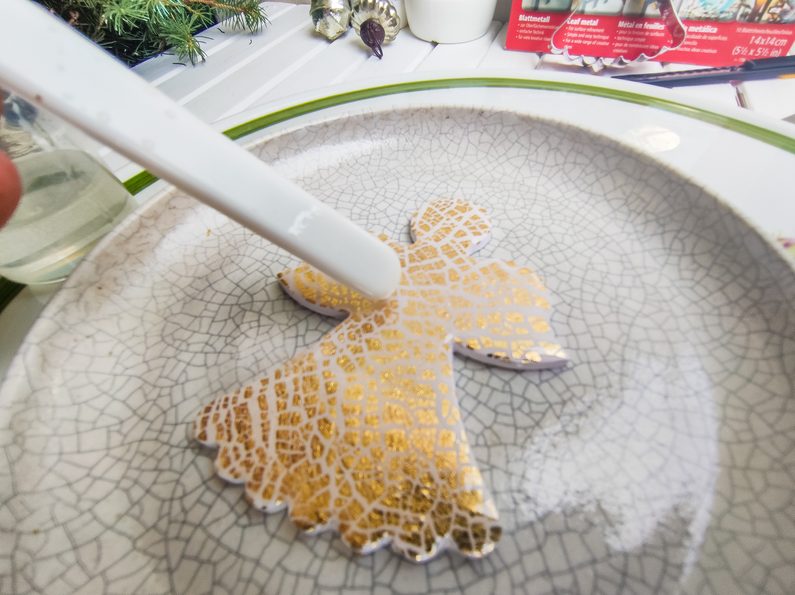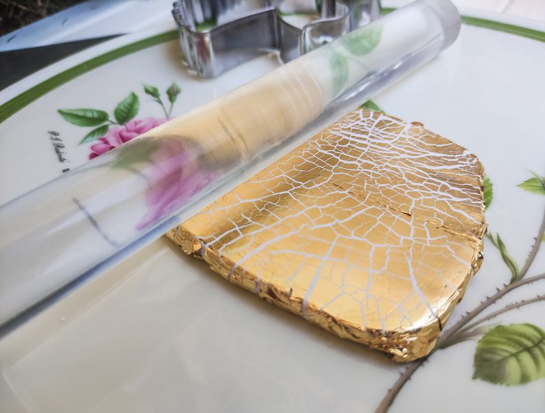 Lícovou stranu pak opatrně rozválíme akrylovým válečkem na potřebnou velikost, přičemž střídáme směry tak, aby vznikla pravidelná krakelace. Výrobek neobracíme zlatou stranou dolů.