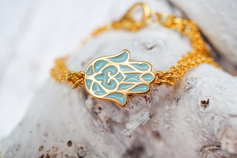 OmegaCast spojovací díl tyrkysová hamsa 21x14mm pozlacený 1 kus