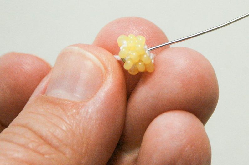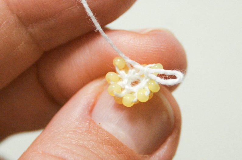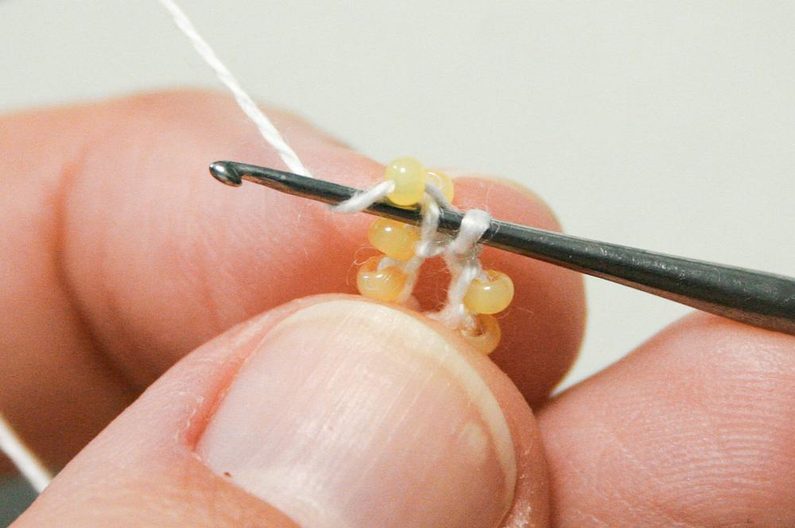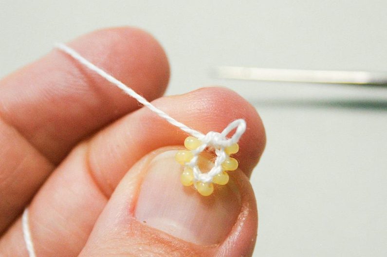 Pak háček zapíchněte do očka zleva od první perličky, otočte perličku dospodu doprava, posuňte co nejblíže další perličku a háčkem zachyťte přízi a uháčkujte pevné očko (protáhněte přízi oběma oky najednou (obr.8). Přidáme perličky do druhé řady a pak háčkujeme pevná oka s perličkami spirálou kolem dokola. Pokud mají všechny perličky ve všech řadách otočenou dírku po směru háčkování (nahoru), postupovali jste správně (obr.09-10)