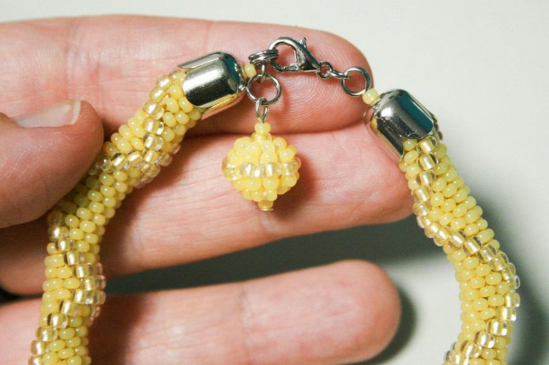 Až budete mít 3-5 řad zastrčíme ketlovací jehlu do dutinky (obr. 11-12) a budeme pokračovat háčkování dál. Jakmile budete mít dutinku v požadované délce, uháčkujte poslední řadu bez korálků. Zbytkem příze přišijte ke konci dutinky ketlovací jehlu, na začátku už máte jehlu. Pak navlékneme kaplík, perličku (podle přání) a uděláme očko kleštěmi s kulatými čelistmi(obr. 13).