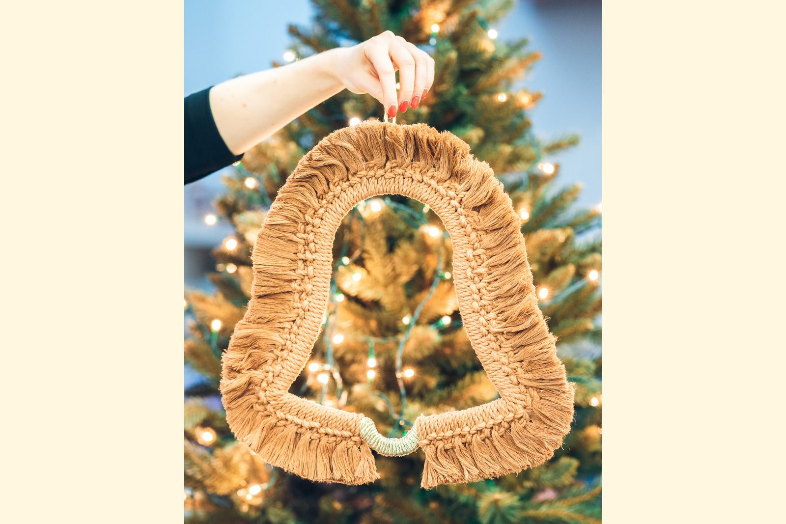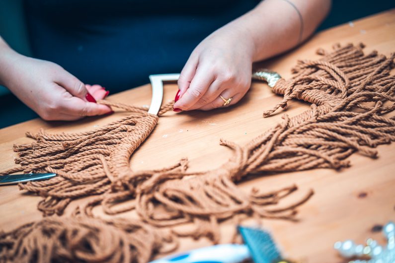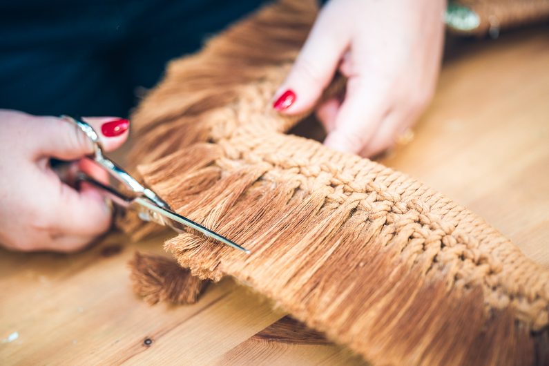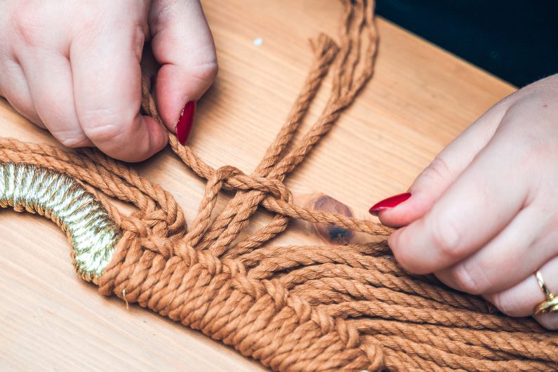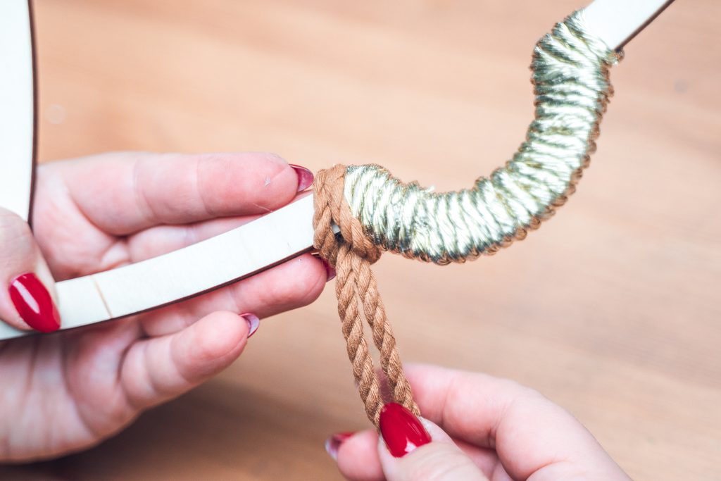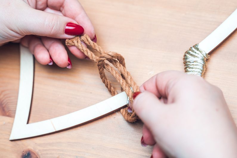 • Připravíme si cca 200 provázků hnědé příze o délce 50cm. Připevníme základním uzlem. Pro masivnější obvod můžeme přidat ještě plochý uzel.