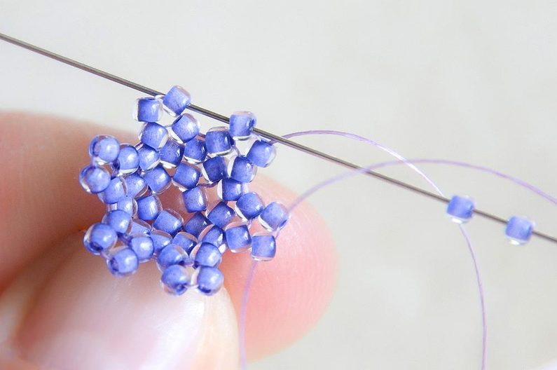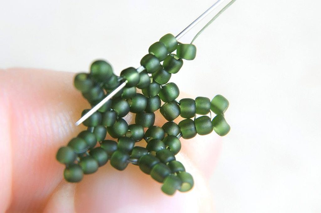 Korálky urovnáme „naplocho“, aby s ostatními dvojicemi nad sebou tvořily „stromeček“. Takto ušijeme celou řadu. Na konci řady prošijeme zespodu korálek z původní řady a ještě první nově přidaný korálek. Tvoří se nám pravidelná hvězdička.