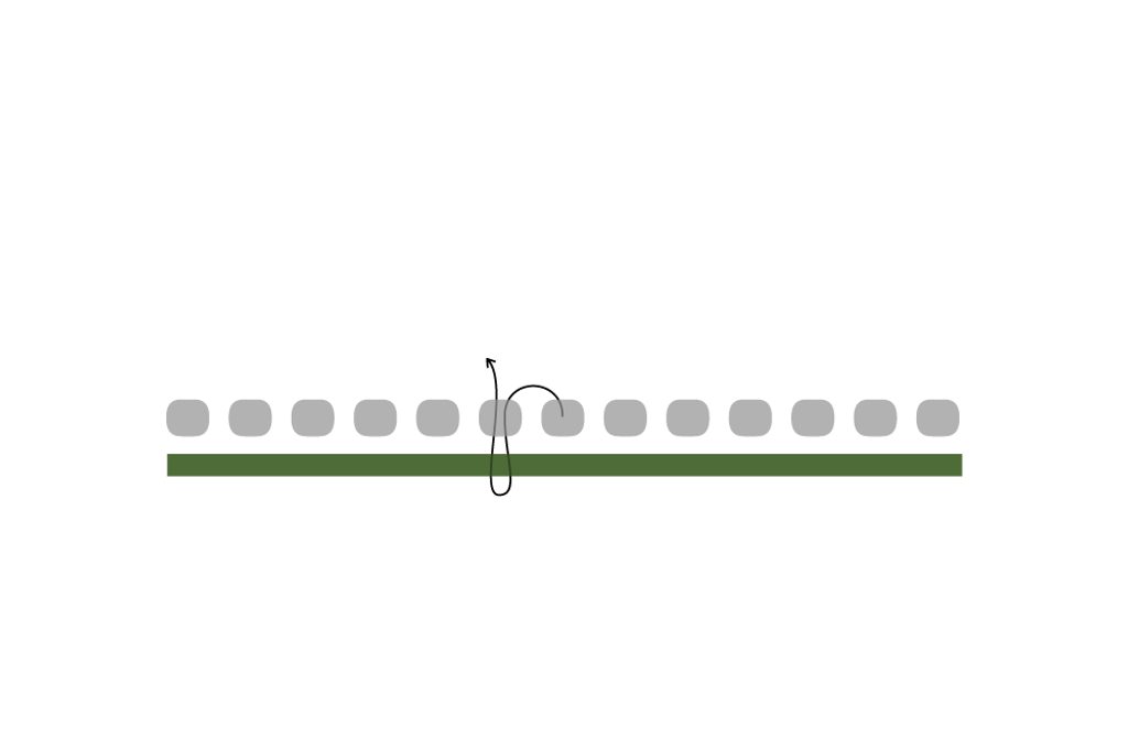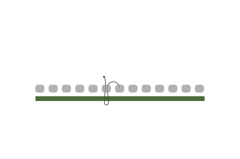 Nyní si vytvoříme stébla trávy. Prošijeme se na lícovou stranu podkladu v místech, kde chceme mít trávu. Navlékneme 2 TOHO 11/0 (tmavě zelenou) a prošijeme se skrz podklad tak, aby korálky ležely vedle sebe.