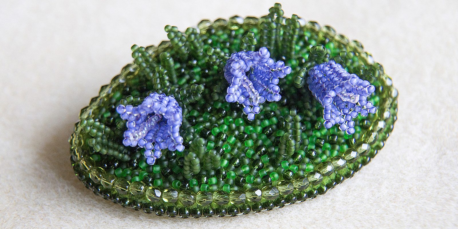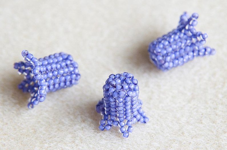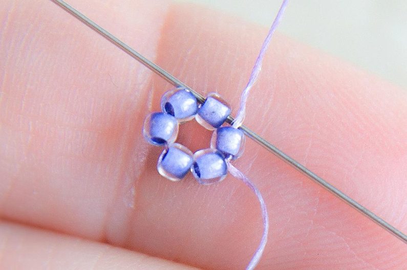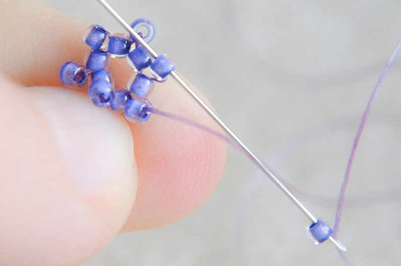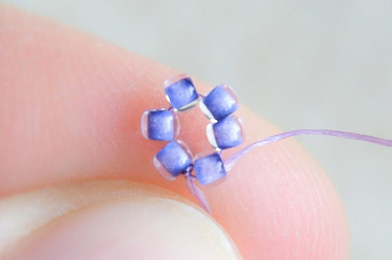 Nejprve si ušijeme kvítky-zvonky. Na nit dlouhou cca 1 m navlékneme 6 TOHO 11/0 (šijeme fialovými korálky). Asi 10 cm od konce nitě je svážeme uzlíkem do kolečka a provlékneme ještě jeden následující korálek.