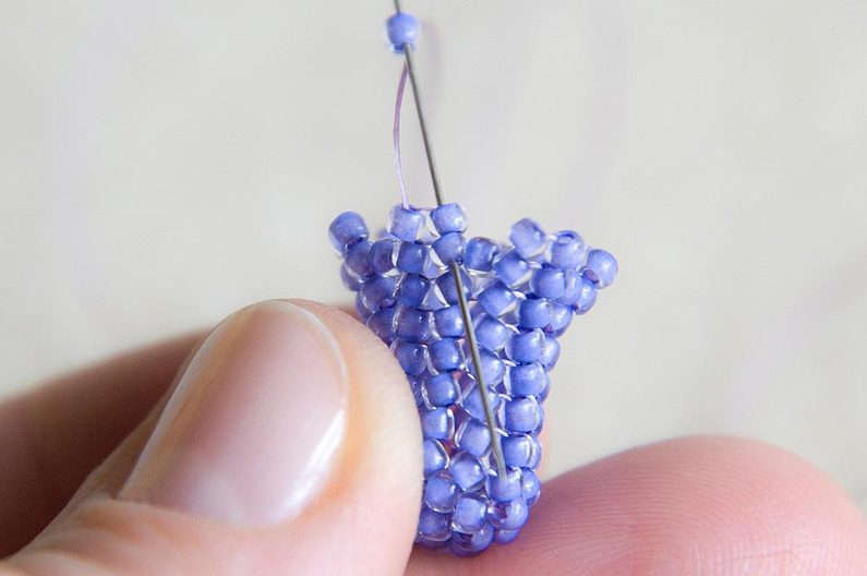 Ušijeme poslední řadu: Navlékneme 1 TOHO 11/0 a shora provlékneme vedlejší korálek ve dvojici. Provlékneme ještě i dva další korálky pod sebou a prostřední korálek. Tři následující korálky nad sebou.