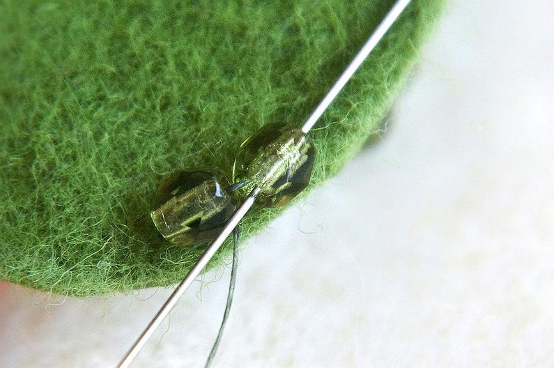 Nyní si ušijeme „čepičku“ na vršek zvonku. Na nit dlouhou cca 0,75 m si navlékneme 5 korálků TOHO 11/0 (šijeme tmavě zelenými korálky). Asi 10 cm od konce je svážeme do kolečka a provlékneme následující korálek.