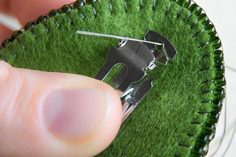 Prošijeme se těsně vedle základu vlasové spony skrz podklad až na lícovou stranu. Takto prošijeme ještě několikrát z lícové na rubovou stranu skrz otvor v základu vlasové spony. Nemusíme se bát, stehy se svrchu schovají mezi korálkovou výšivku.