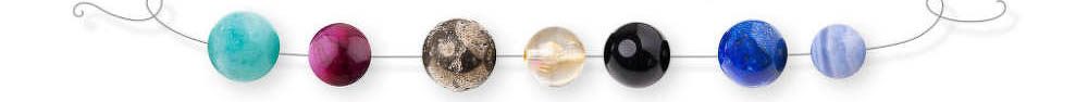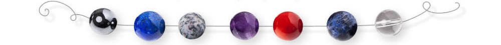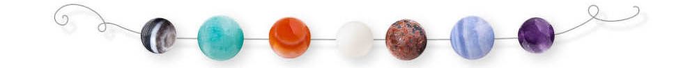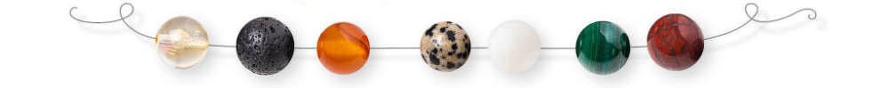 Hematit, Lapis lazuli, Šedý jaspis, Ametyst, Červený korál, Sodalit, Křišťál