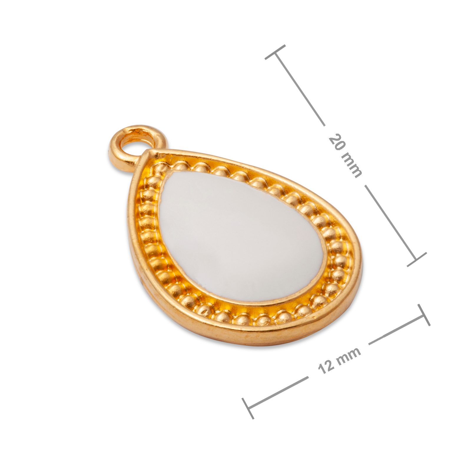 Manumi přívěsek bílá kapka v ozdobném rámečku 20x12mm pozlacený je komponent se speciální smaltovou úpravou, který bude ideální do vašich Boho náramků nebo náhrdelníků. Díky povrchové úpravě vzácnými kovy můžete komponent zkombinovat například se stříbrnými nebo pozlacenými řetízky. Vyniknou také na jiných návlekových materiálech, jako jsou kožené řemínky nebo Shamballa šňůra.