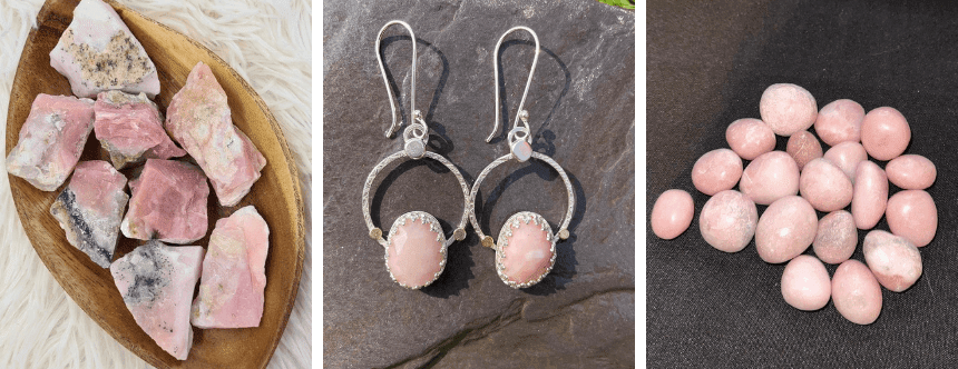 V přírodě se růžový opál nachází v podobě drúz, kulatých nebo oválných tvarů nazývaných noduly, které jsou ideální pro výrobu šperků, a dále v podobě výplní pórů nebo jako součást horniny. V každém případě přírodní růžový opál má velmi silné účinky. Na Mohsově stupnici odpovídá jeho tvrdost číslu 5,5 až 6,5.