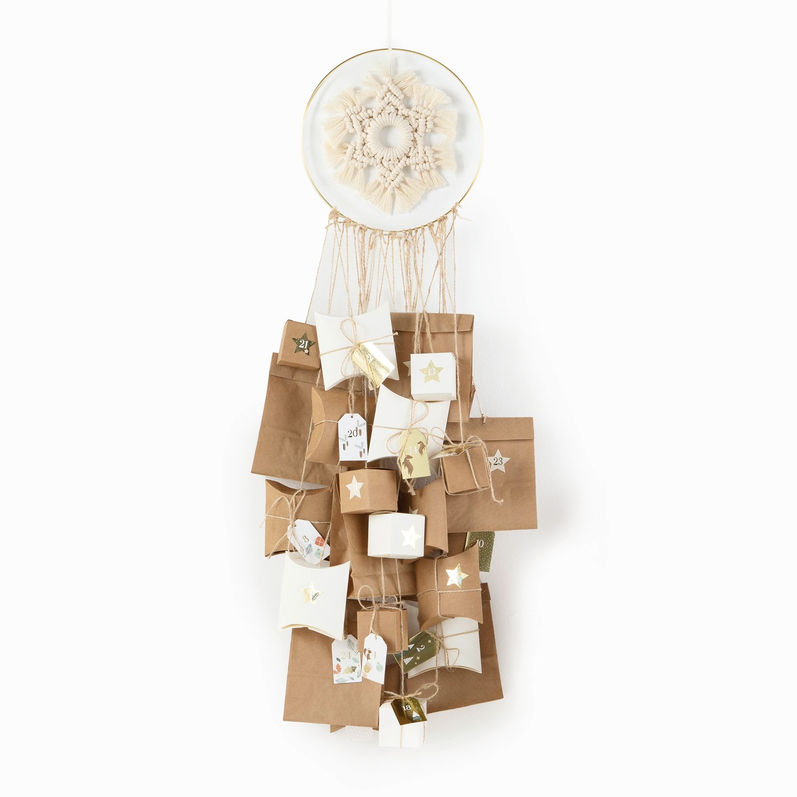 V balení najdete kovový kruh ⌀ 23 cm, 9 krabiček 10 x 10 cm, 9 krabiček 5 x 5 cm, 6 papírových taštiček 12 x 21 cm, 12 samolepek ve tvaru hvězdy, 12 papírových kartiček pro čísla dnů, 3 dřevěné korálky s velkým průtahem ⌀ 1 a 2 cm, dřevěný kroužek ⌀ 5 cm, příze a provázek. Sada neobsahuje dárečky, ty musíte do taštiček a krabiček doplnit vy (nebo můžete poprosit vánočního skřítka).