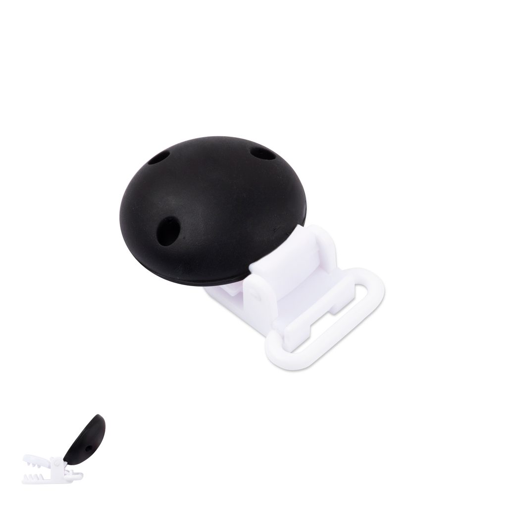 Silikonový klip na dudlík 33,5mm s plastovou sponou Black je doplněk určený k tvorbě ozdobných řetízků na dudlík pro miminka. Klip můžete snadno připnout na dětské oblečení a pomocí nylonové saténové šňůry a dřevěných nebo silikonových korálků vytvořit krásný a praktický doplněk, který zajistí, že už nebudete muset hledat dudlík pro své miminko všude po domě. Klip je silikonový a spona je plastová, takže jsou snadnější na údržbu. Miminko je může polít nebo zašpinit jídlem a klip i sponu poté stačí omýt vodou.