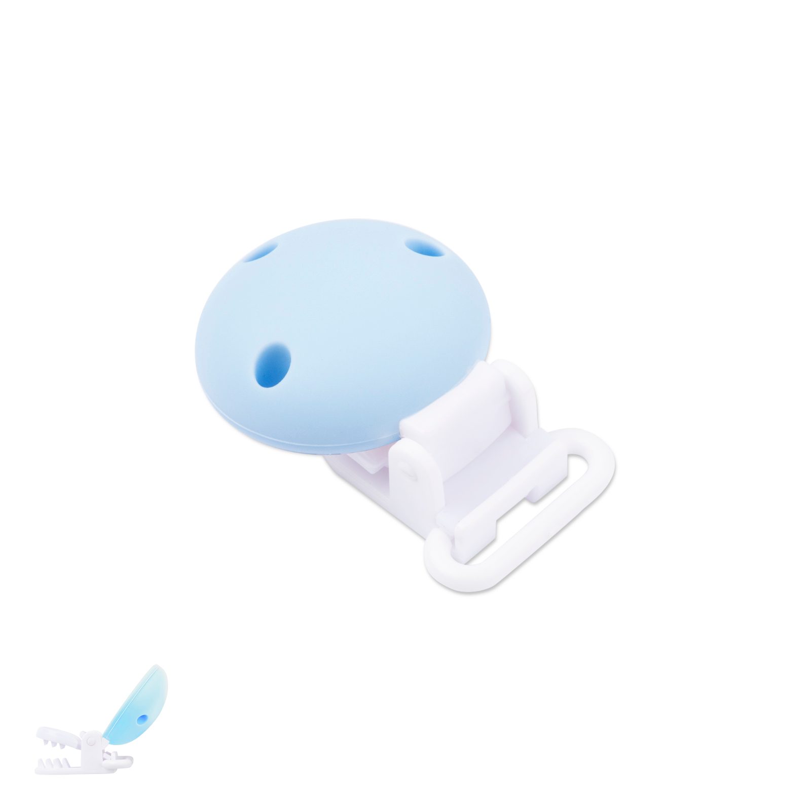 Silikonový klip na dudlík 33,5mm s plastovou sponou Pastel Blue je doplněk určený k tvorbě ozdobných řetízků na dudlík pro miminka. Klip můžete snadno připnout na dětské oblečení a pomocí nylonové saténové šňůry a dřevěných nebo silikonových korálků vytvořit krásný a praktický doplněk, který zajistí, že už nebudete muset hledat dudlík pro své miminko všude po domě. Klip je silikonový a spona je plastová, takže jsou snadnější na údržbu. Miminko je může polít nebo zašpinit jídlem a klip i sponu poté stačí omýt vodou.